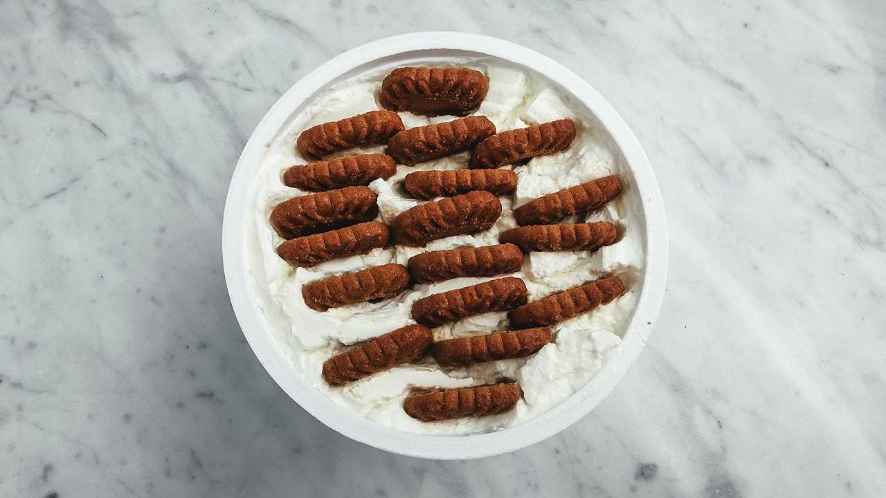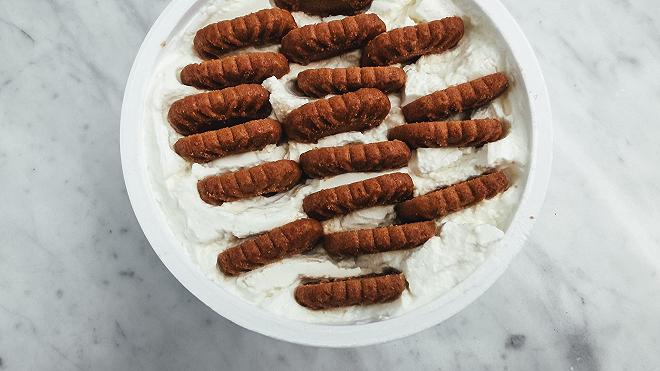 - Un numero non meglio indicato di biscotti Lotus Biscoff: perché i Lotus? Perché sanno di spezie e zucchero caramellato, l’unico mix sensoriale in grado di bilanciare l’acidità dello yogurt.
