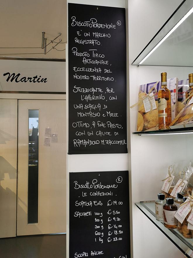 Il risultato è un frollino rotondo di 3 cm che trova in una croccantezza resa più articolata dalla farina di mais, nel rimando alle note alcoliche e soprattutto nella presenza del sale – trasformando il contrasto dolce-salato in un gioco assai piacevole – i sui tratti distintivi. Nell’accogliente pasticceria di via Montereale 23, al Biscotto Pordenone viene giustamente riservato un ruolo di primo piano, ma in tono misurato: gli eleganti pacchetti fanno bella mostra di sé, esposti con cura e se capita di fermarsi per un gelato, ecco che il biscotto viene servito in accompagnamento.