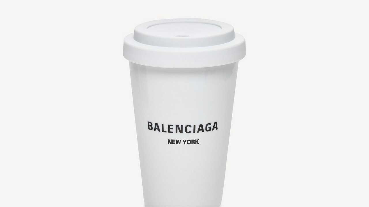 La tazza è di porcellana, è alta 13 cm e tiene 30 ml, è fatta in Cina, si può lavare solo a mano e non la si può sottoporre a fonti di calore (il che per una tazza da caffè non è utilissimo). Però sul sito di Balenciaga è garantita come strumento di sostenibilità (altro che la plastica usa e getta).