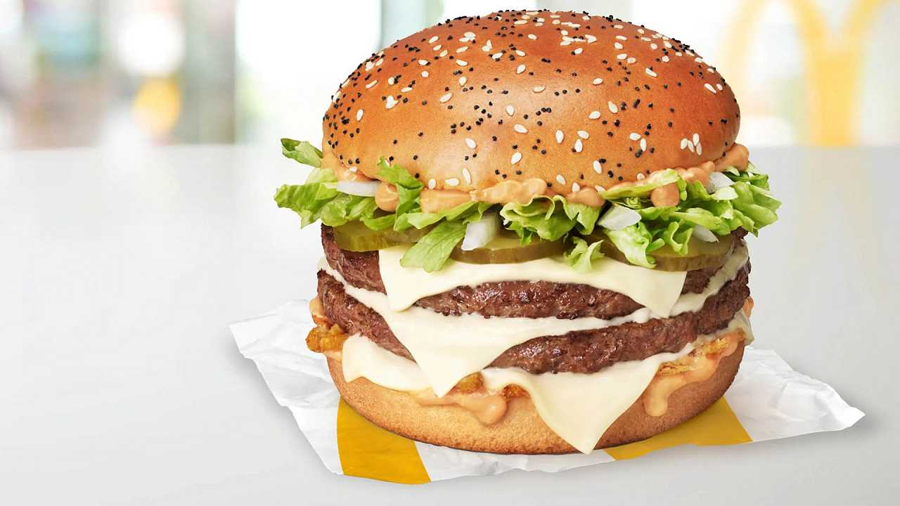 Sempre più grande, sempre più pieno di ingredienti. Nella continua corsa al record di McDonald’s, il nuovo hamburger ha due polpette di carne, tre fette di cheddar, cipolla croccante e cipolla fresca, cetriolini, insalata e la salsa Big Arch®.