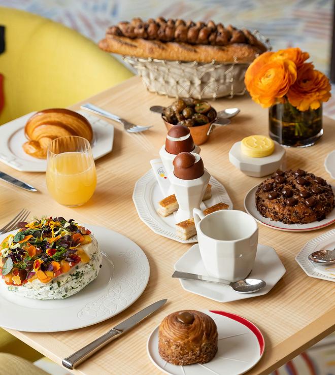 Tutto è alla carta, ché i buffet sanno essere terribilmente volgari, soprattutto quando c’è da mettersi in coda. Si scelgono le bevande calde (caffè bio, espresso, caffè filtro, ma anche una bellissima selezione di te e infusi) e poi si decide cosa mangiare, pescando dal menu delle meraviglie di Maxime Frédéric, Pastry chef de Le Cheval Blanc Paris, Miglior Pasticcere del Mondo 2025 per la The World 50 Best Restaurants. A tavola vi viene portata una selezione di viennoiseries classica, burrosa e parigina, e un cestino di pane da mangiare a morsi o imburrare (siamo in Francia, suvvia), e comunque mordere generosamente.