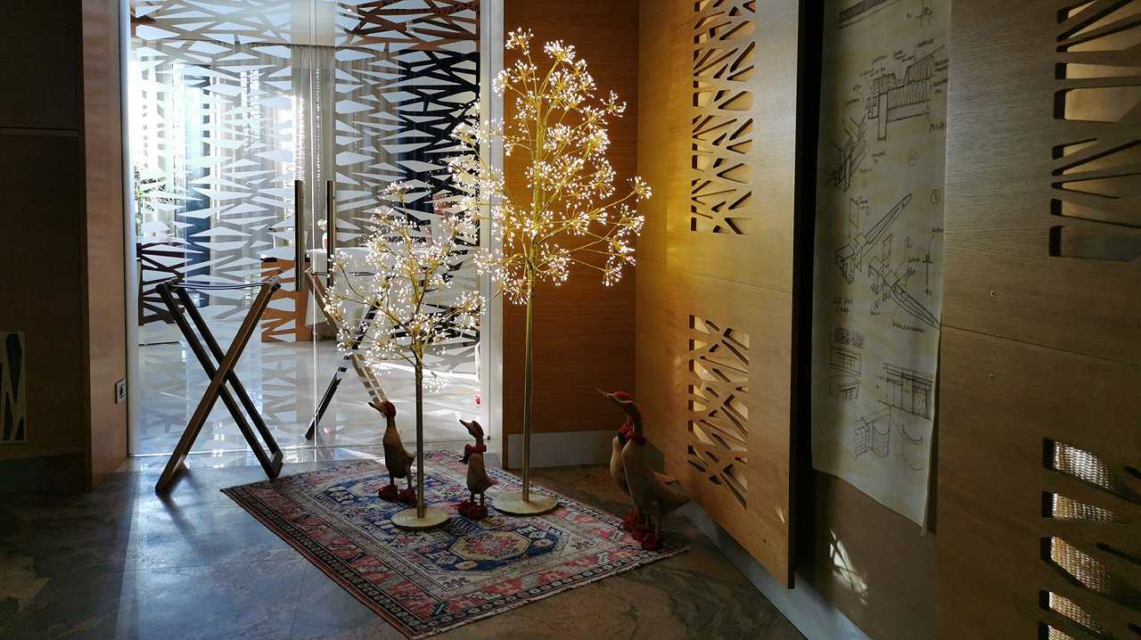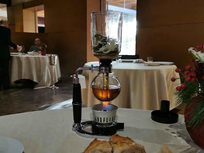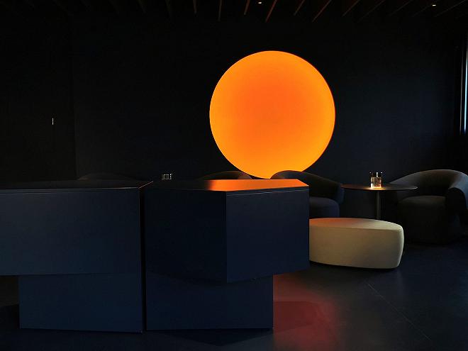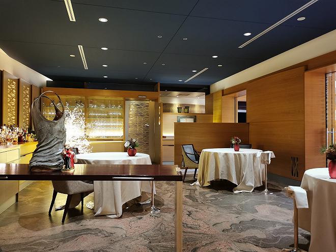 Il passaggio da uno scenario di piccola città di provincia a grande palcoscenico gastronomico si compie appena varcata la soglia. Oltrepassata una tenda, ci si ritrova immersi in quello che può ben essere definito come il foyer del ristorante: una sala blu con una “luna” piena a fare da sfondo, poltroncine geometriche, bancone a vista, affettatrice scintillante e supporti mobili e modulari per il servizio. E’ lo spazio destinato all’aperitivo (in carta: cocktail, etichette prestigiose e amuse bouche) per chi intenda approfittarne, che consente agli ospiti di arrivare poi a tavola procedendo per gradi ed accostandosi lentamente allo stile Scarello, fatto di accoglienza misurata nei toni, attenzione all’ospite, raffinatezza estetica, funzionalità ed essenzialità.