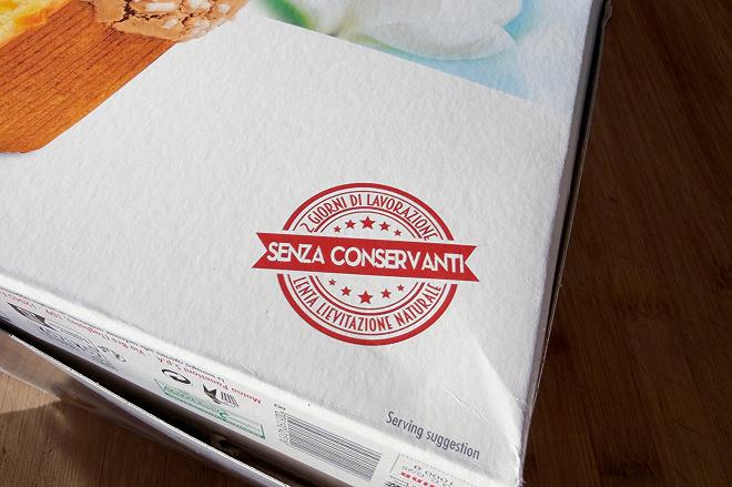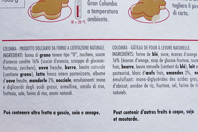 Lista Ingredienti: farina di grano tenero tipo “0”, zucchero, scorze d’arancia candite 16% (scorze d’arancia, sciroppo di glucosio-fruttosio, zucchero), uova fresche, burro, lievito naturale (contiene grano), latte fresco intero pastorizzato, albume d’uova fresche, mandorle 2%, nocciole, emulsionanti: mono e digliceridi degli acidi grassi, armelline, amido di riso, fruttosio, sale, farina di riso, aromi naturali.