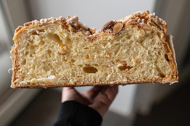 Nelle sezioni illibate, emerge invece il difetto ben percettibile di questo tipo di produzione: una mollica densa e fitta. Per mantenere intatta una ricetta così pulita fino a ben dopo Pasquetta, l’industria è costretta a saturare l’impasto di emulsionanti (mono e digliceridi degli acidi grassi).
