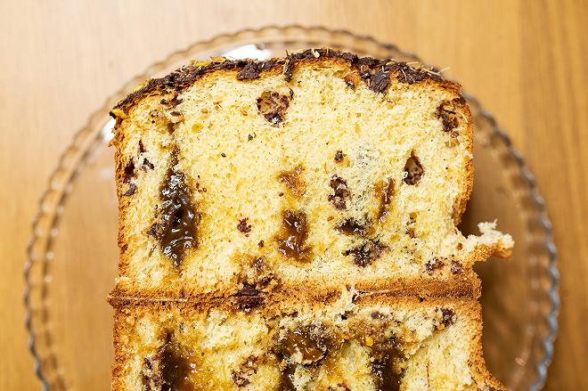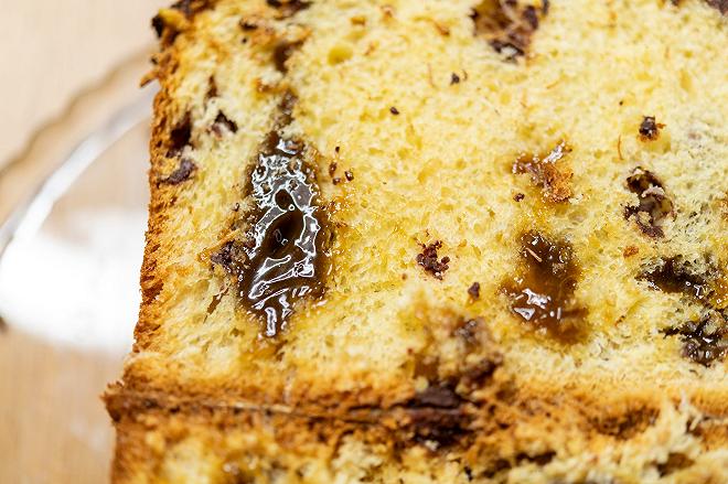 Il dolce al taglio risulta lievemente gommoso, il coltello si fa strada con qualche difficoltà, sfrangiando l’impasto in più punti. Lo apro e sopresa, la crema al pistacchio è vischiosa e traslucida, somiglia molto a un dulce de leche (il caramello a base di latte tipico dell’America Latina). La mollica è densa, grassoccia, una merendina XL che non sfiocca come un vero panettone.