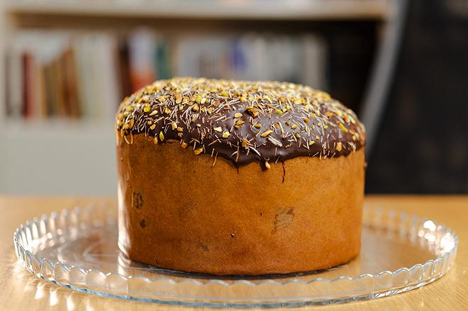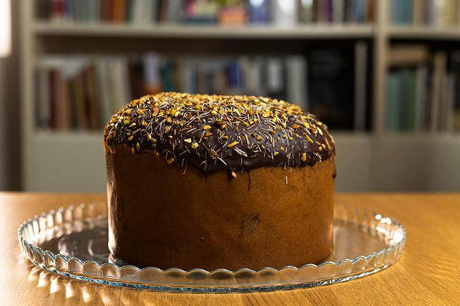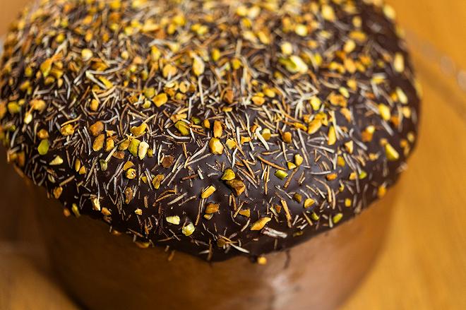 Panettone senza uva sultanina e scorze di agrumi candite con pezzi di cioccolato al latte, farcito con crema al pistacchio, ricoperto di cioccolato e decorato con granella di pistacchi e pasta kadayif. Prodotto dolciario da forno a lievitazione naturale.