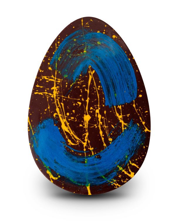Le crepe, messe in risalto, rendono ogni creazione unica, come un’opera d’arte. Il cioccolato è fondente al 63%. All’interno, come sorpresa, una selezione di ovetti.